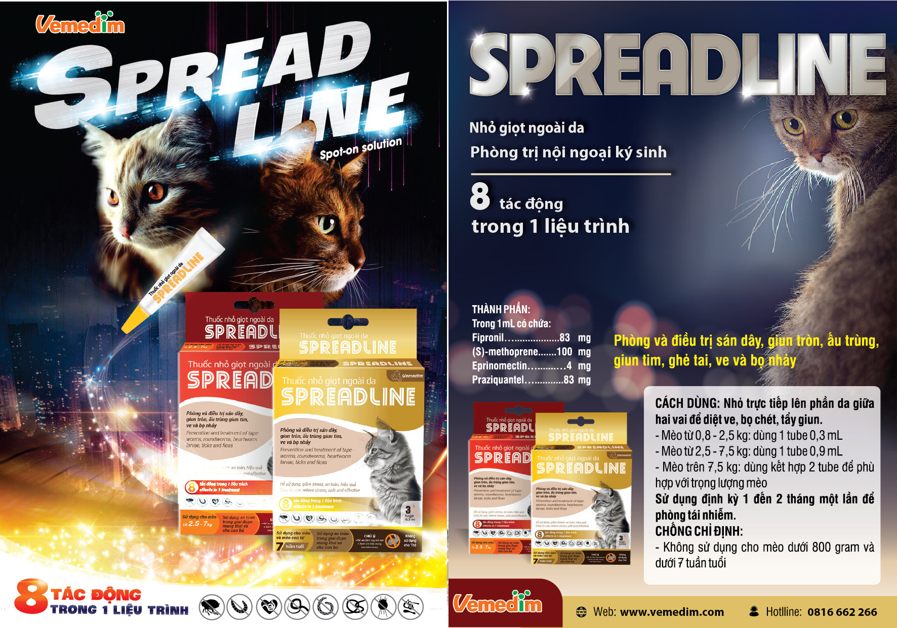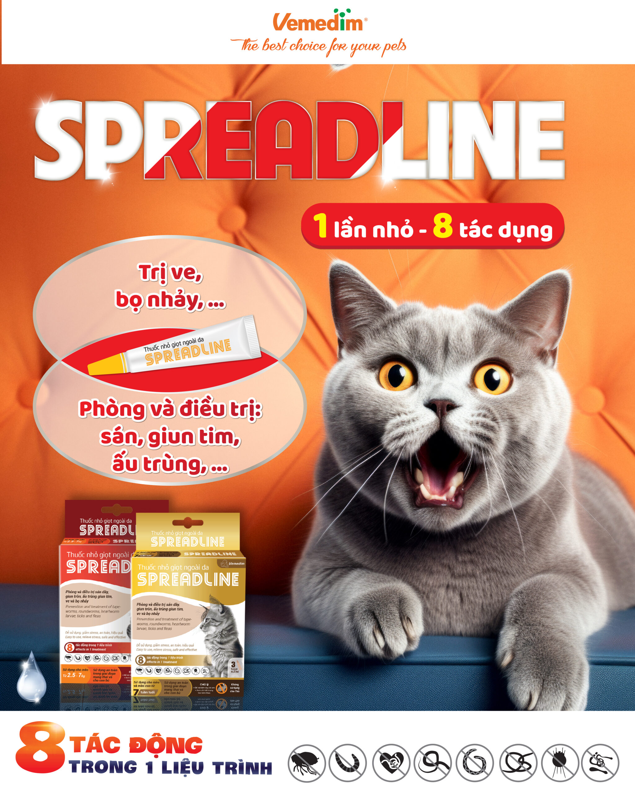 Vemedim SPREADLINE – Thuốc nhỏ giọt ngoài da phòng và điều trị sán dây, giun tròn, ấu trùng giun tim, ve và bọ nhảy cho mèo